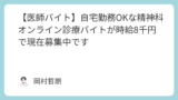 自宅でのオンライン診療バイトに興味をお持ちのドクターが、まず悩むのが「どんな診療科なのか?どんな業務内容なのか?」というところだと思います。私も最初、「内科医だし、生活習慣病で通院中の患者さんに処方するようなバイトはないものか」と探していま...