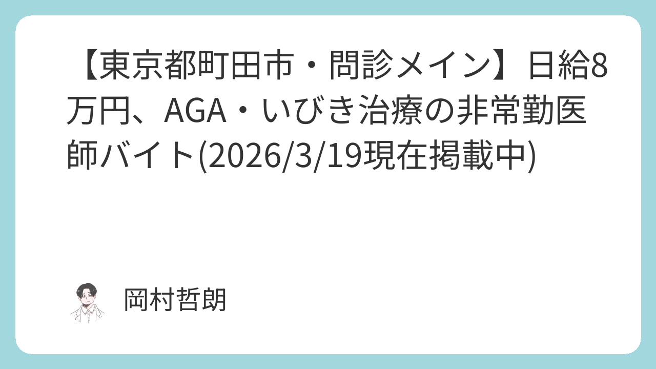 東京都町田市に位置するクリニックでの非常勤医師募集です。AGA・いびき治療を中心とした自由診療ですが、業務のメインは問診であり、専門性不問、幅広いドクターの応募が可能となっています。