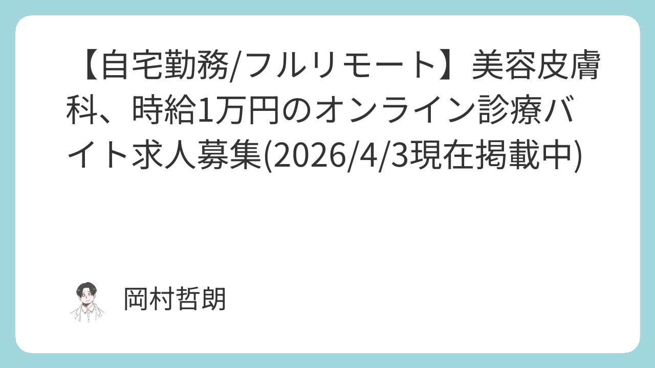 【自宅勤務/フルリモート】美容皮膚科、時給1万円のオンライン診療バイト求人募集(2026/4/3現在掲載中)