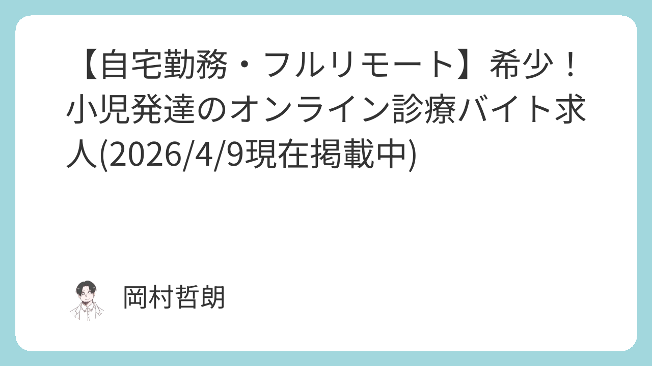 小児発達領域に特化した、非常に希少なフルリモートのオンライン診療バイト求人となっています(自宅から勤務可能)。診療内容は小児の発達に関する相談・診療が中心で、一般的な外来とは異なり、じっくりと患者や保護者と向き合うことができる点が特徴です。近年ニーズが高まっている分野であり、専門性を活かしながら社会的意義の高い医療に関われる点も大きなメリットです。