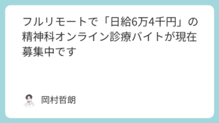 おすすめのバイト求人情報 自宅での勤務可能な「精神科」オンライン診療バイトの求人(応募条件ゆるめです) 精神科とオンライン診療の相性の良さゆえか、やはり定期的にフルリモートのバイト求人を見かけます。そんな中、エントリーがしやすく、なおかつ働きやすそうな求人を今回はご紹介したいと思います。オンライン診療バイトの求人、特にフルリモートでの求人を探... 2025.09.03 おすすめのバイト求人情報